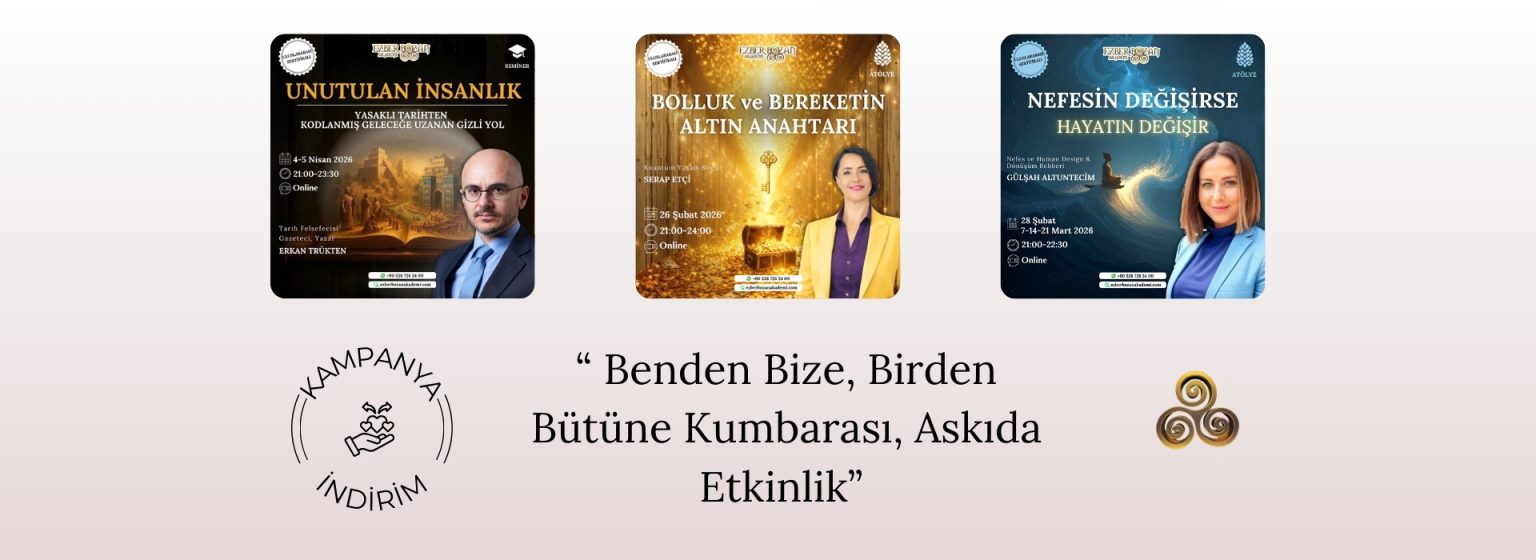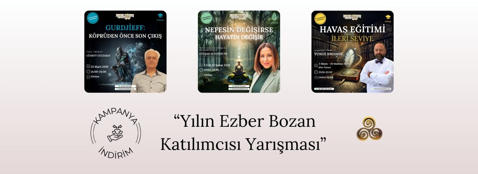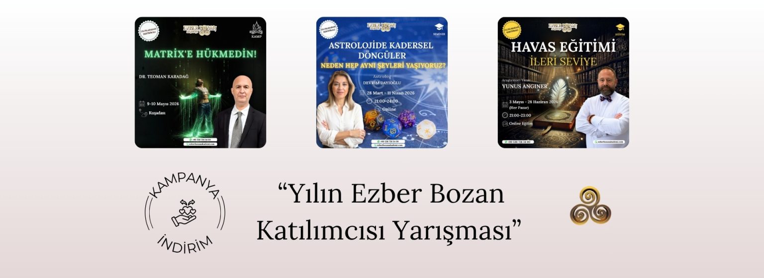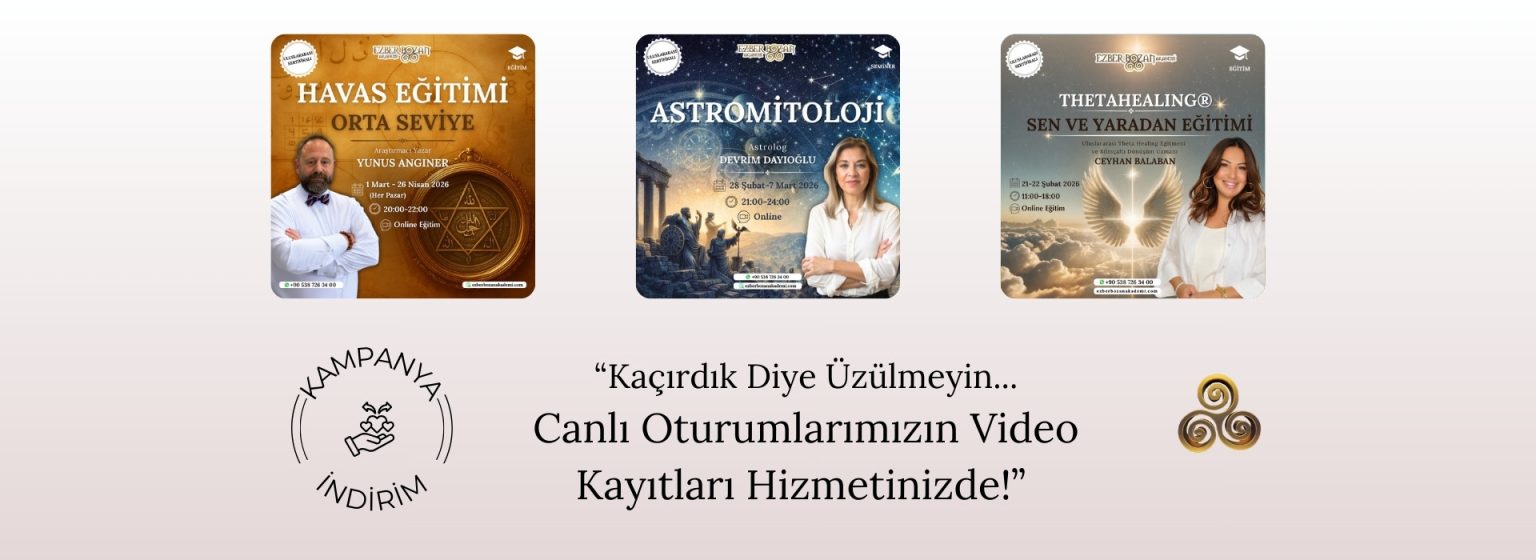 Ezber Bozan Akademi ile çok farklı ve ilgi çekici konularda, alanının en iyi eğitmenleriyle eğitimlerimize katılabilir, sır yolculuğunda yetkinliklerinizi geliştirerek kişisel gelişiminizi artırabilirsiniz. Aşağıda yer alan güncel eğitimlerimizi inceleyebilir, dilerseniz TÜM EĞİTİMLERİMİZİ İNCELEYİN butonunu kullanarak gerçekleştirdiğimiz tüm eğitimleri görebilirsiniz.