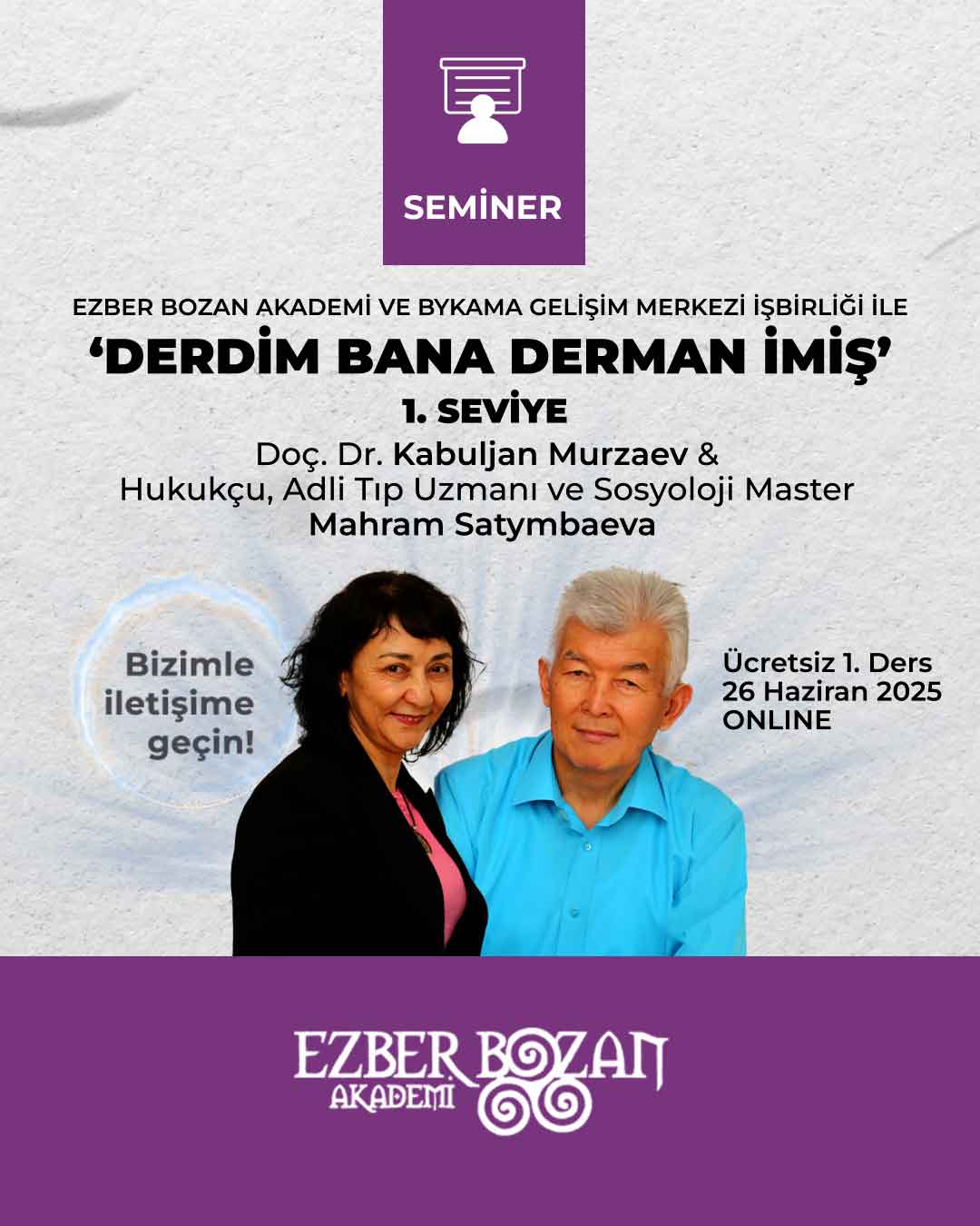 📢 Ezber Bozan Akademi ve ByKAMA Gelişim Merkezi işbirliği ile düzenlenen Doç. Dr. Kabuljan Murzaev & Hukukçu, Adli Tıp Uzmanı ve Sosyoloji Master Mahram Satymbaeva ‘Derdim Bana Derman İmiş’ 1. Seviye Semineri’nde sizlerle buluşacak!