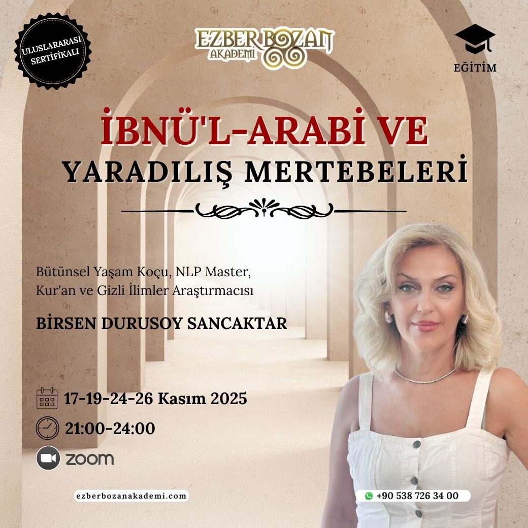 📢 “İbnü’l-Arabi ve Yaradılış Mertebeleri” eğitimi ile Bütünsel Yaşam Koçu, NLP Master, Kur’an ve Gizli İlimler Araştırmacısı Birsen Durusoy Sancaktar, Ezber Bozan Akademi’de sizlerle buluşacak!